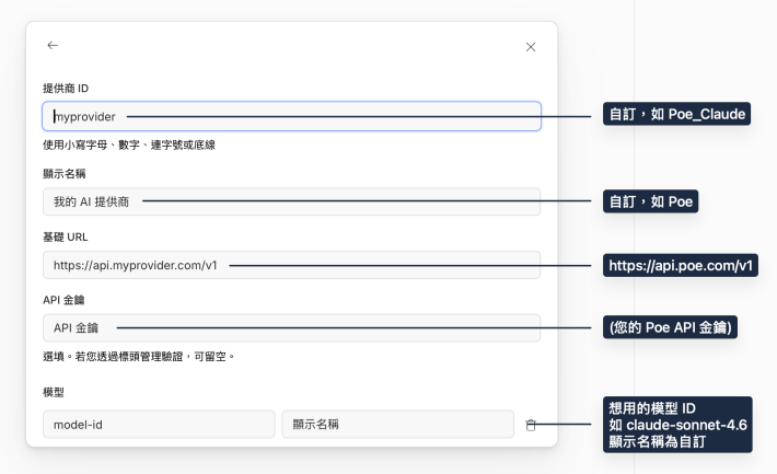 - Provider ID: (e.g.) Poe_Claude